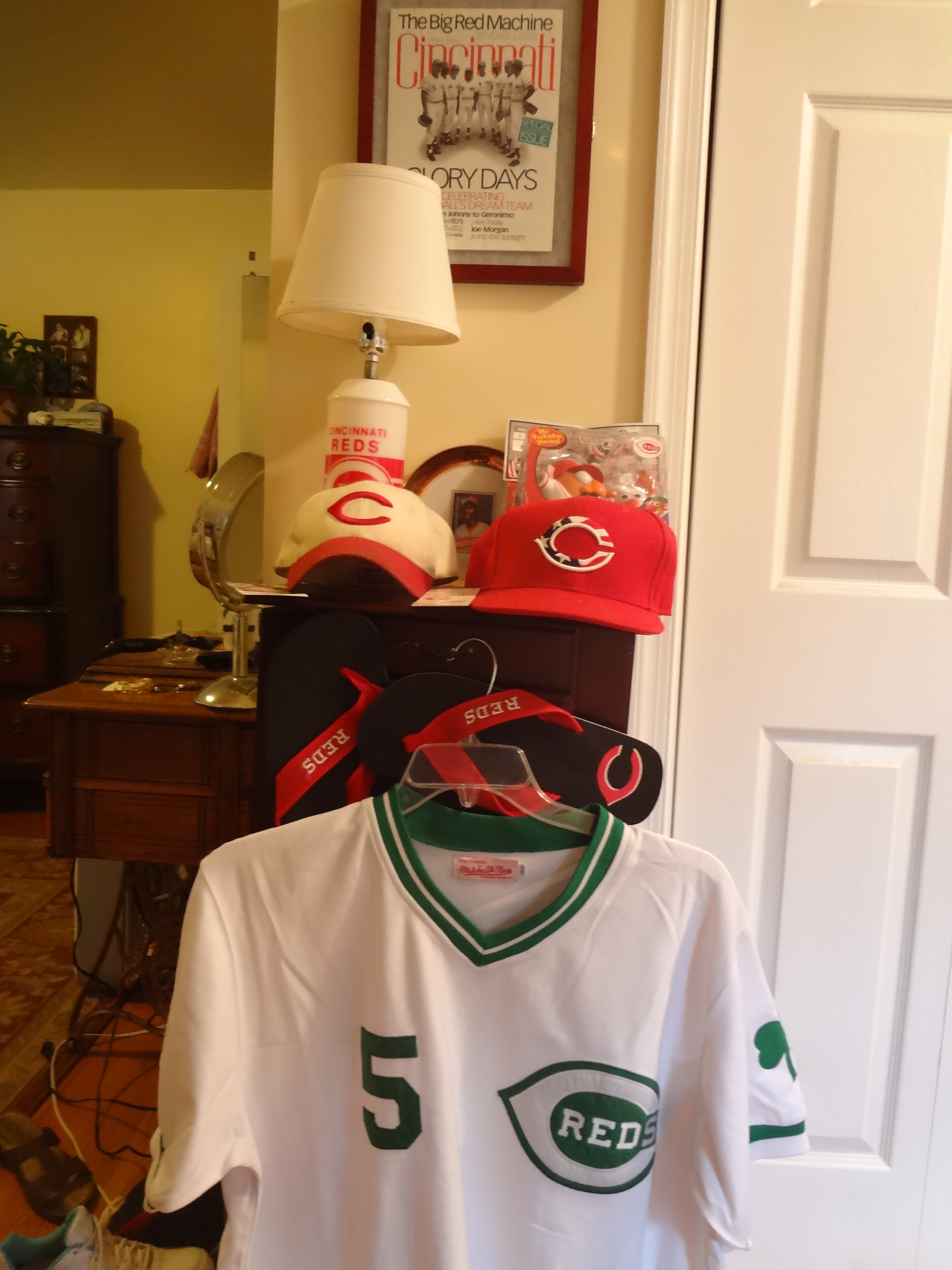Just a sample of my Reds memorabilia: Cincinnati Magazine featuring The Great Eight on the cover… A 50’s-era replica white hat with Red wishbone C… The red, white and blue hat that gets worn on Memorial Day & Independence Day… one of the green jerseys the team used to wear on St. Patrick’s Day (note the shamrock on the shoulder)… a ticket from 1993 and 2012… an Eric Davis commemorative plate (circa 1988)… my Reds flip-flops… and the Reds Mr. Potato Head kit.