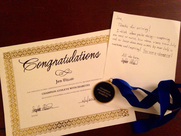 3. Send me an e-mail at champswithdiabetes@gmail.com. Tell me your name, name of the athlete (it’s okay if it’s you), and your address (gotta know where to send the medal). Most important, tell me what athletic goal was accomplished, and when. Extra points if you tell me how you felt accomplishing the goal. Full disclosure: I reserve the right to use your testimonial here, on Twitter, and on Facebook. I will not use your name if you don’t want me to. As always, I will never share private information.
