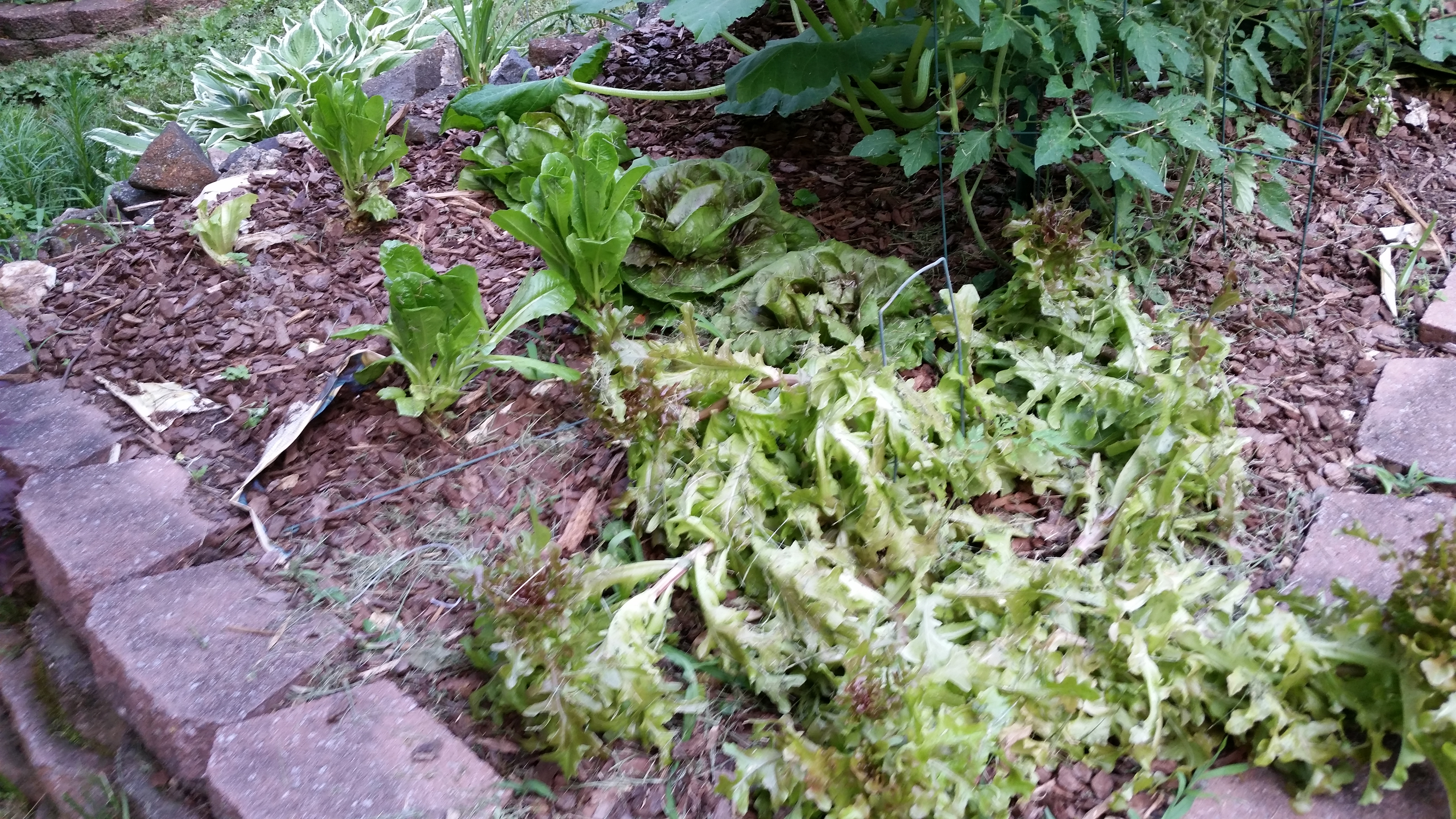 But, more bad news: In Monday night’s thunderstorm for the ages, my red leaf lettuce plants got pelted and fell over. This looks like the beginning of the end for these guys, which is sad because I’ve been eating salads nearly every day for over a month. I mean, these guys were the gift that keeps on giving. We’ve already eaten the romaine… there are just a few secondary shoots that have grown back, and they’ll make good salad. In addition to that, most of the radicchio (to the right of the romaine) has done very well.