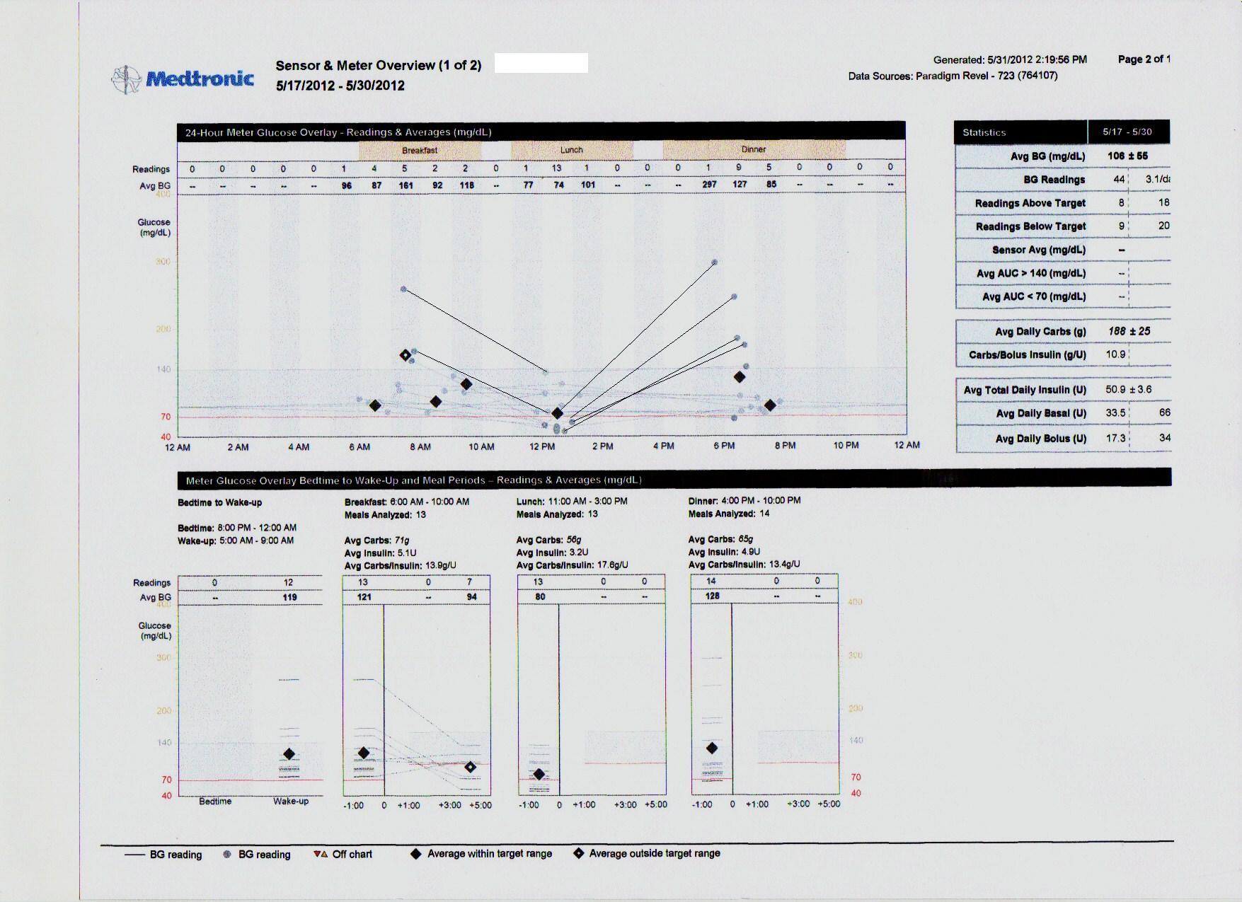 I know it’s hard to read, so I embellished it with a couple of lines of my own, only to help point out where my trouble is. Right in the middle of the day! My okay to slightly high morning and evening readings over the last two weeks (with a couple of exceptions) were counter-balanced by almost universal lows around lunchtime. It made my average BG over the last two weeks: 106.