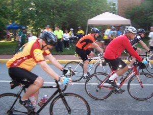 At the start… I’m trying simultaneously to get clipped into my pedals and keep from getting run over.